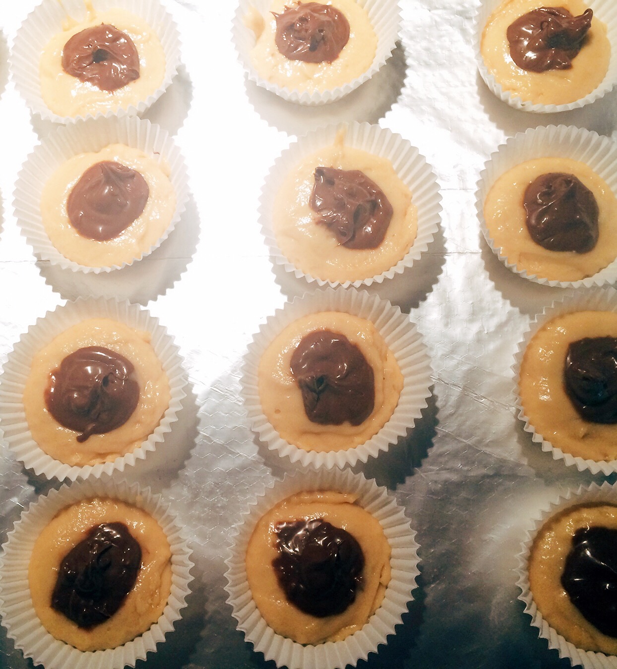 Fill with 1 -2 cm of cookie dough. Then make a well shape in each cookie and spoon in a generous amount of Macabella (I chose the Crunch, but either is really good!)