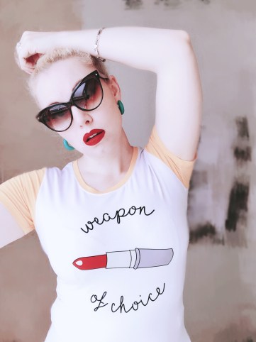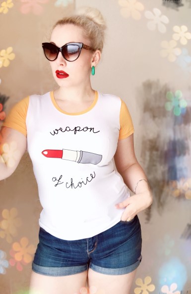 I love it teamed with my Levis cut offs and colourful wedge heels. But it also looks cute with skirts and jeans (I have a pair of soft purple flares that make it a more retro look). The cat eye sunglasses here are vintage ones, but if you love retro and vintage shapes, you HAVE to take a look at Betty and Veronica’s sunglasses!