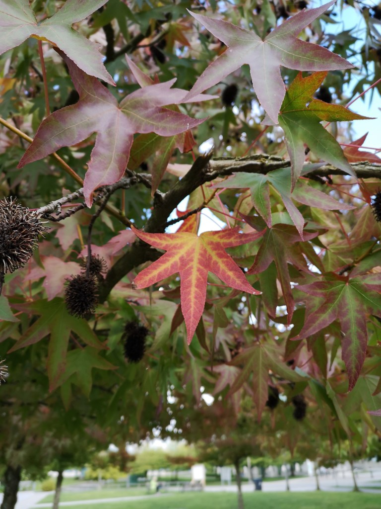 Liquidambar styraciflua. American Sweetgum. The tree with the star-shaped leaves and spikey fruit. My favorite Latin tree name to say. Not that you wanted to know.