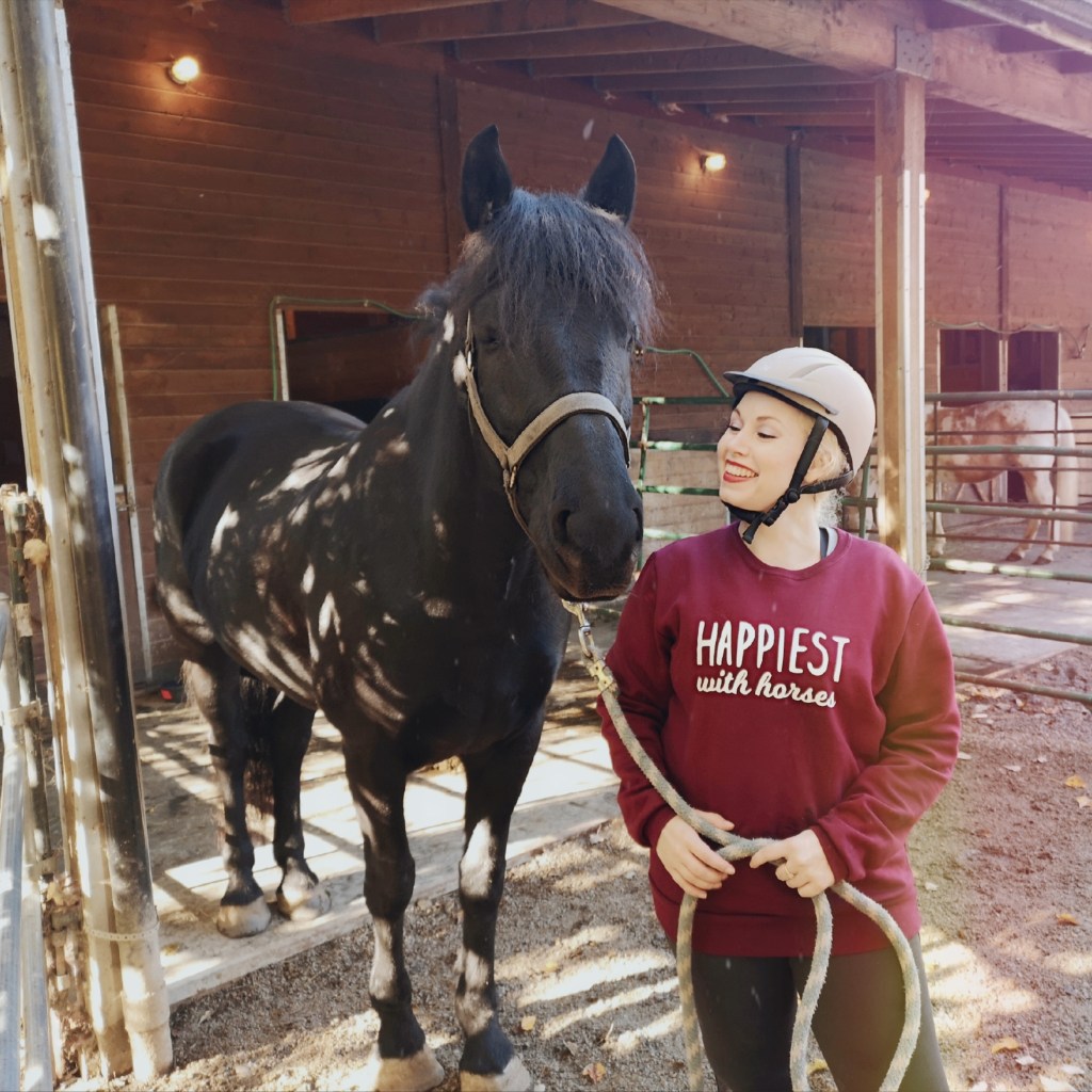 I’m obsessed with this cute sweater that my friend sent me from her store The Happiest Collection. It’s about 12c as I write this, but I’m warm and cozy. In case you don’t know this Canadian brand, it’s a range of womens, mens and childrens tees, tops and more that all feature different mottos for your “happiest”. Perhaps you’re happiest while reading, happiest with pizza, happiest outdoors… All the items are really cute and soft, and come in a range of colours and styles. I’m Happiest With Horses.