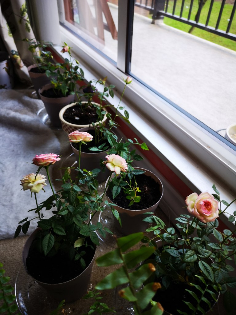 The mini roses that you buy in the store generally don’t do well indoors. They sell them around Valentine’s, advertised as indoor plants but they often die not long after flowering. The thing to know about them is that they’re actually more than one baby plant in the pots. So, once you’re ready to re-pot them, you need to gently separate them into different pots. As you can see below, from two tiny pots of roses, I had 7 plants! I let them have a little time to recover from shock after their repot, and now all 7 live outside on my balcony. To discourage aphids naturally, I’ve placed foil under the plants, cinnamon on the soil and garlic too. Any of these three are meant to discourage the awful rose-vampires, but since they don’t hurt the rose plants, I went with all three! Ha ha!