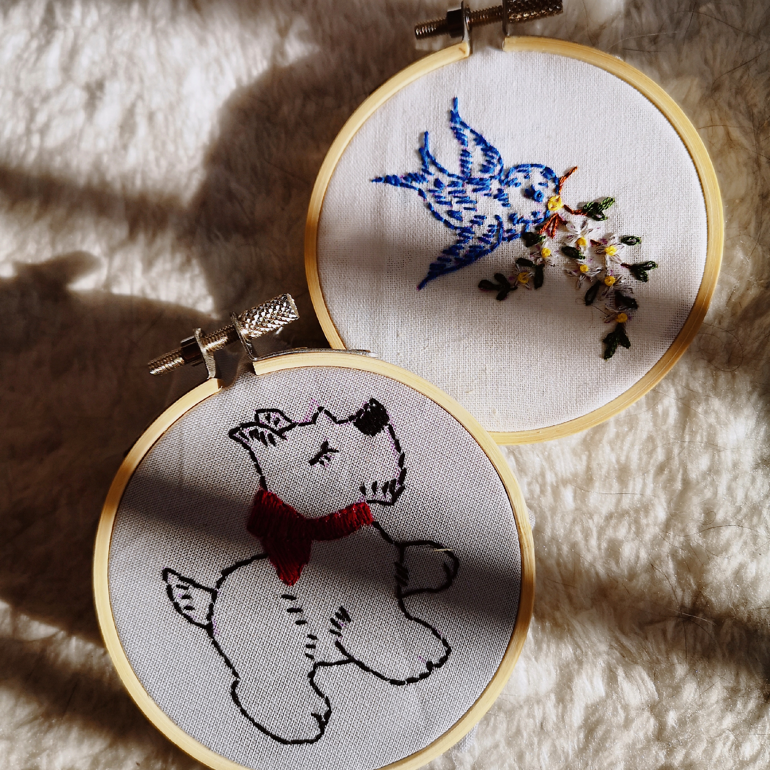 This little Scottie dog and bluebird bird are hand embroidered. They come from vintage patterns that were popular in I think the 50s. Very midcentury. The patterns were really cute, but I was still surprised by how well they turned out. The stitches in these are really basic, but really effective. I think these patterns would be cute embroidered on a pillow case or on a plain tee or sweater. So I might try that out. I have a bunch of these patterns and I’m looking forward to trying out different ones. A lot of these patterns are in the public domain now too.